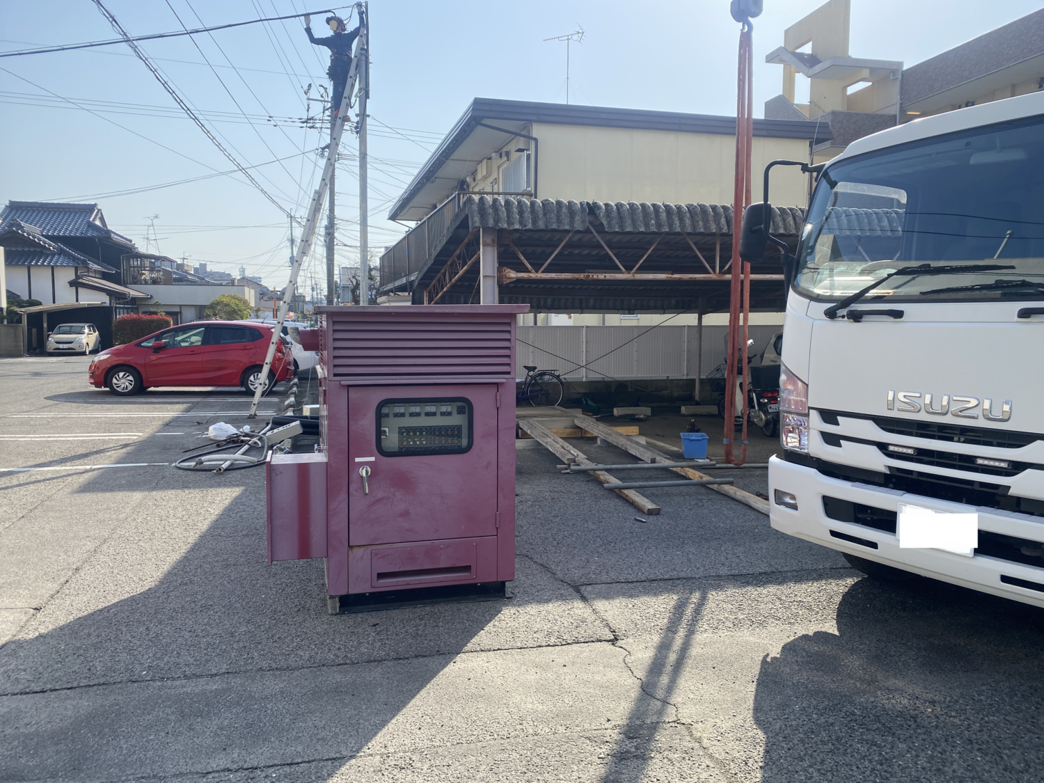 佐賀県某所にて銀行の非常用発電機入替工事、承りました。 ユニック車を所有してるため、大きな機械の入れ替えも対応...